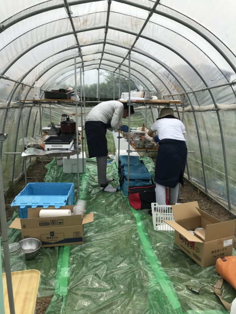 食材を入手してから、何を作るか考えたと。この場所も数日前に下見し、ミニハウスの中の草を片付けての準備。前日からの徹夜で仕込み、食材をお持ち下さいました。