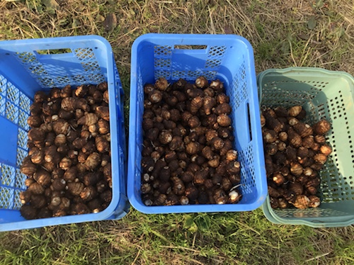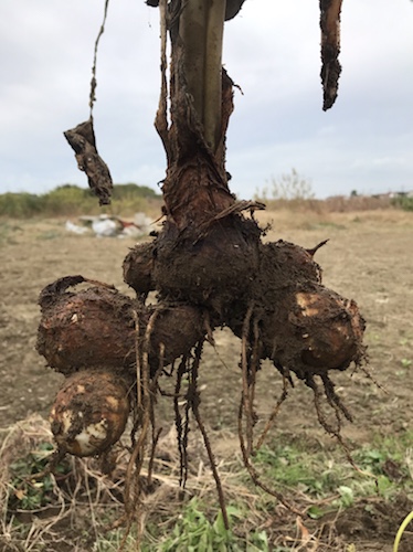 里芋の収穫は、かなり面倒。じゃがいもやさつまいもと違い、里芋は芋から芋が生え、根が太いので、土を取り除くのが大変。根を取り除くのも大変。引き抜いても、土が一緒に沢山くっ付いて来る。収穫するのに時間がかかる。