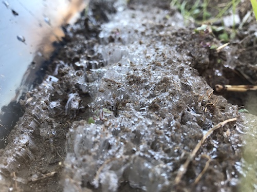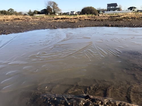 真冬の足跡。 真冬の足跡。 今朝の冷え込みは、真冬の寒さとなりました。畑にも真冬の痕跡が。のらぼう菜の雫は氷の玉となり、秋の輝きとは異なる輝きをしています。水溜りにはうすーい氷が張りました。土と冷たい大気の間に、霜柱になりきれていない霜柱が生まれました。 真冬の足跡です。 Share: Twitter Facebook Google+