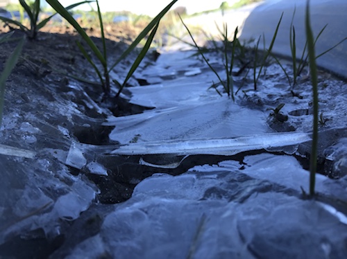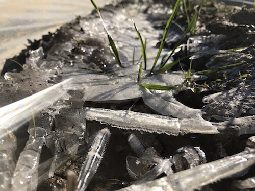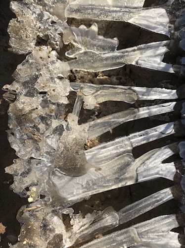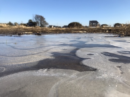 地面近くを写真に収めました。水溜りや土の表面の水分がいろいろな表情を見せてくれます。地面と水分量と冷気の状況で、様々な形を作ります。水溜りでは、湾曲したラインが等高線のようにみえます。霜柱はもちろん、梁状に氷ができたりしています。光の加減で、キラキラと輝いています。