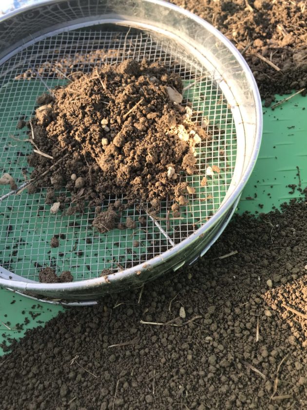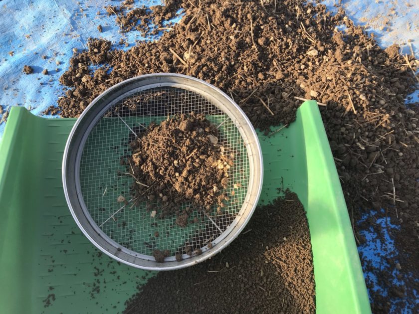 網目が10ミリくらいのふるいに掛けると、覆土として、軽くまける程度のふわふわした土になります。