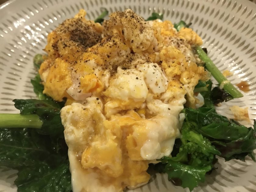 油を敷いたフライパンでのらぼう菜を軽く炒める。皿に炒めたのらぼう菜を乗せる。同じフライパンに、油を敷き、卵を焼く(卵2,3個、今回は3個使用)。半熟くらいにする。のらぼう菜の上に乗せる。ブラックペッパーをふりかけ、醤油をひと回し。