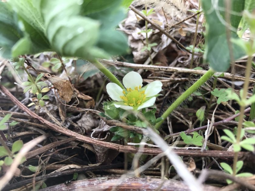 そんな中で、イチゴの花が咲いているのを発見しました。まだ寒さも残っているので、実になり、赤くなるのには時間が掛かります。