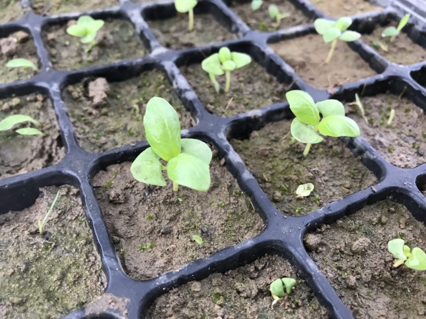 一方、スイートバジルは一粒蒔きをしたら、虫に食べられてしまい、育っているものが少ない。あまりの疎にちょっと悲しい。生きているものは、キレイに葉を伸ばしています。触れると、小さいながらも、とても良い香りがします。