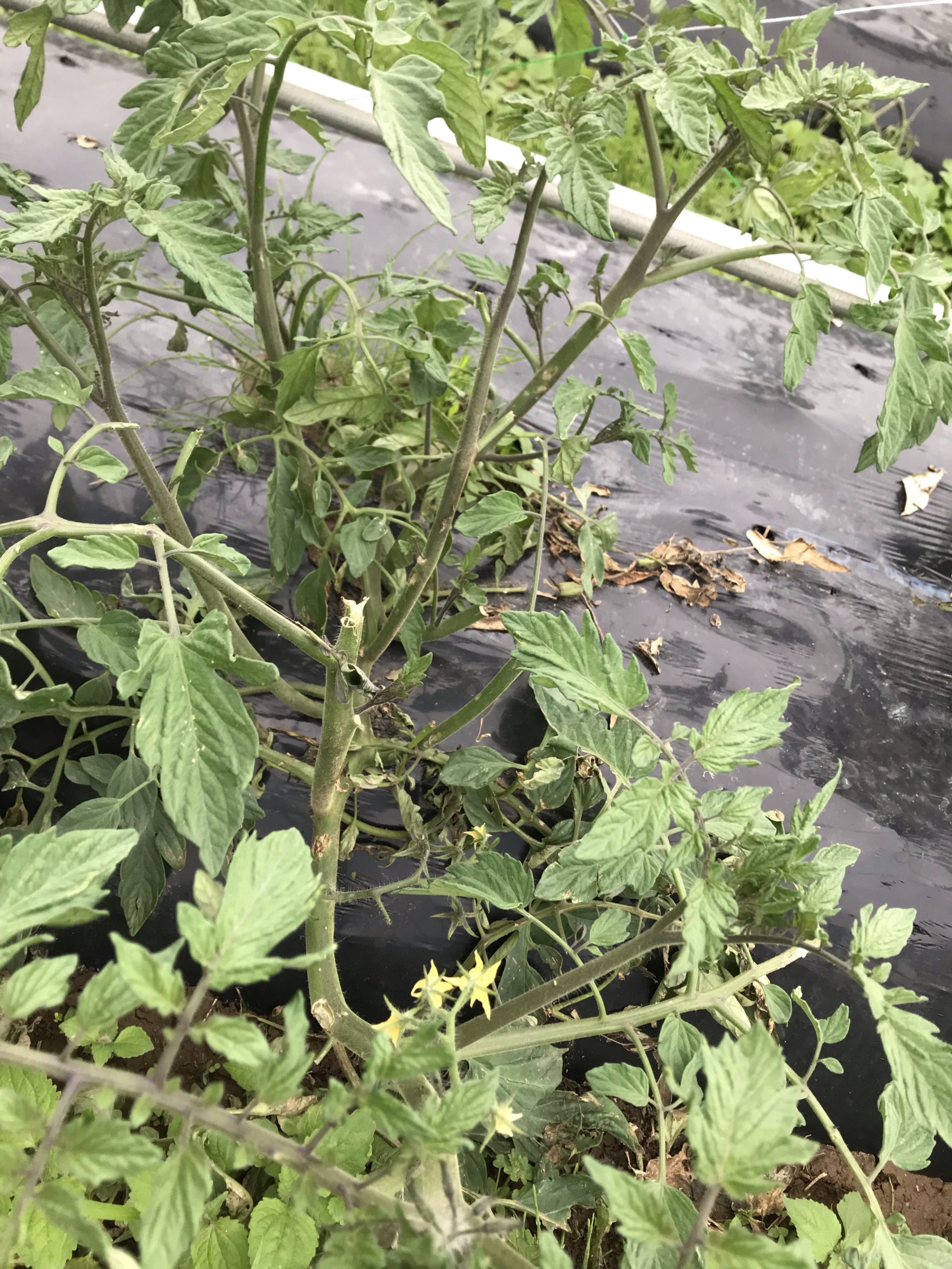 中玉トマトの雹後。 ・中玉トマトの雹後 雹被害のレタス類に時間が割かれ、他の作物に時間が取れずにいます。 雹被害後に、沢山の応援を頂き、作業に追われていました。 トマトも雹の被害を受け、幹が折れるものもありましたが、けなげに脇芽を伸ばし、成長し続けています。 できかかったトマトに雹があたり、傷つくものもあります。 それでも、次の花を咲かせ、次の実を実らせるために、成長しています。 赤く、美味しくなるのが待ち遠しい。 Share: Twitter Facebook Google+