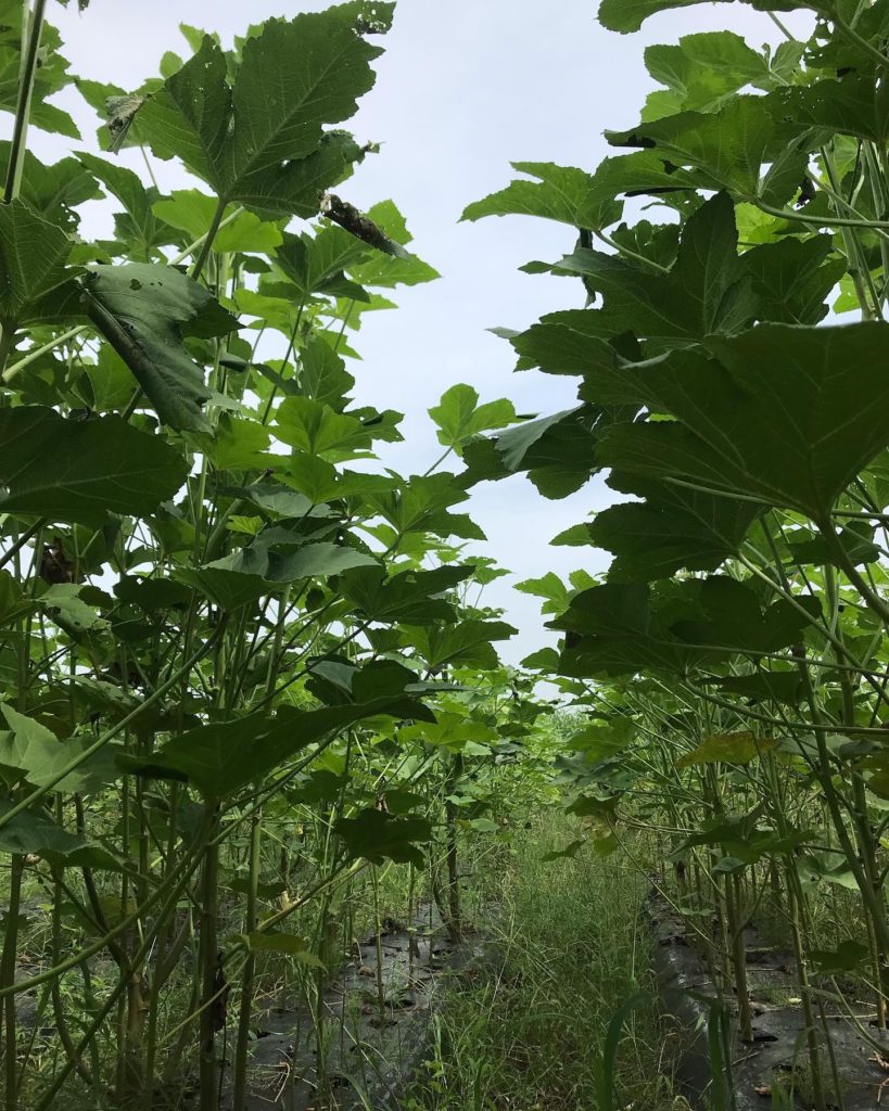 八丈オクラは木のように大きくなり、2mを超えてきました。日々オクラトンネルの中での収穫です。