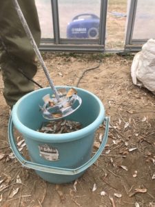 サヤ付き豆をバケツに入れ、ブレンダーのレバーを引く。適度な回転で、豆を弾き出してくれた。