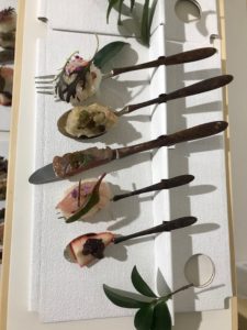 ステキなカトラリーがズラッとならび、その上に、一口サイズの一品が添えられる。カトラリーの下には、紙盆が置かれ、1人分が区分けされている。
