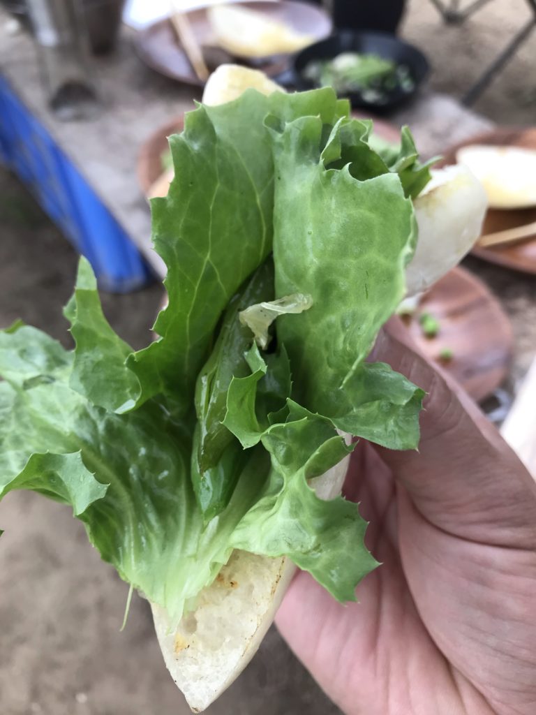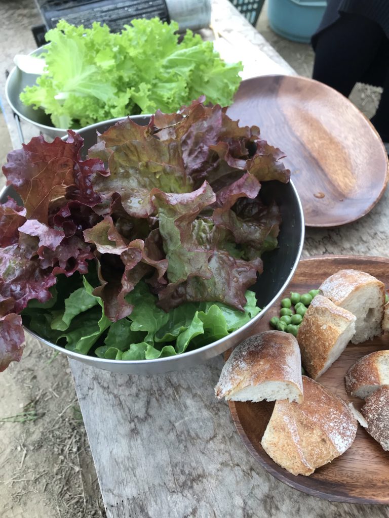 畑ランチ ・畑ランチ 昨日雨の中、来客があり、畑でのランチ。畑で摘んだ野菜を、ビニールハウスで簡単調理し、旬の食材を堪能する。 いもにんじんさんで、パンを購入し、松島農園での採れたて自然栽培レタスやスナップえんどうを挟んで、いただく。 元同僚の古い付き合い。いつも楽しい情報を届けてくれます。雨の日の素敵な時間をありがとう。 Share: Twitter Facebook Google+