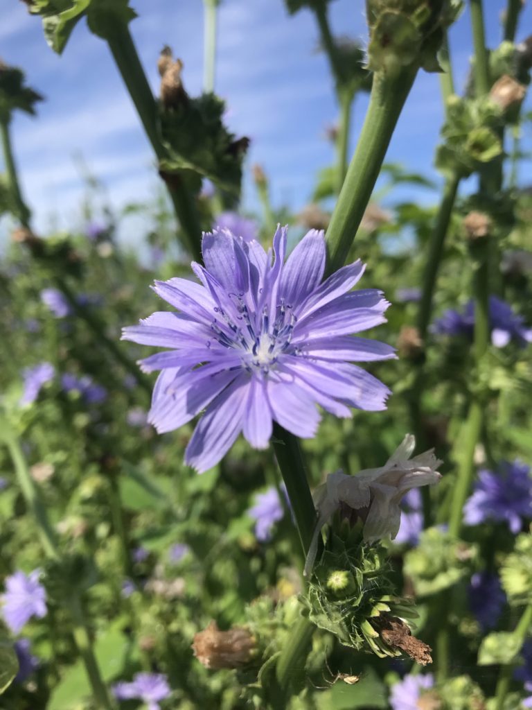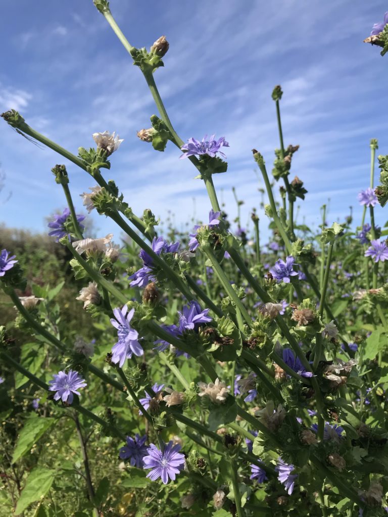 紫色でやや大輪なのがエンダイブの花。涼しげなカラーです。