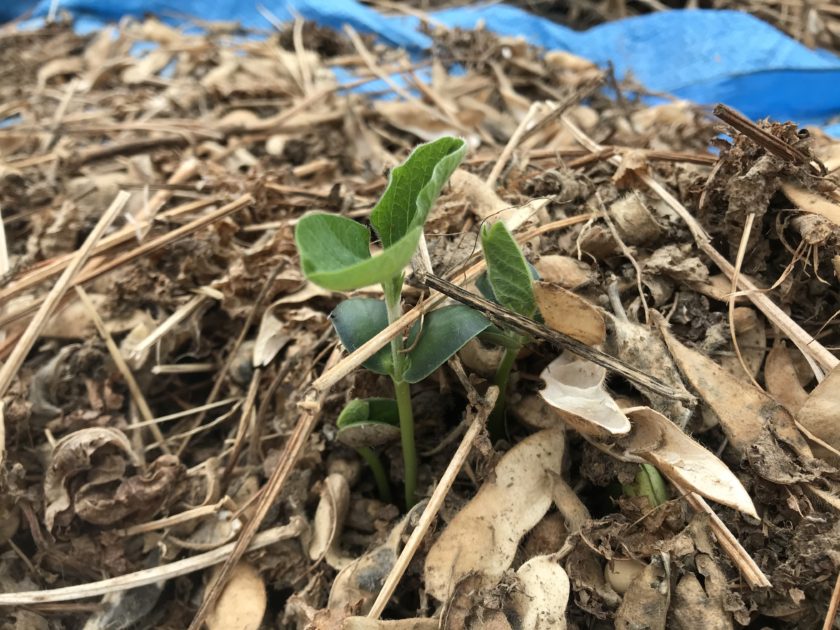 ブルーシート上の大豆の芽。 大豆…